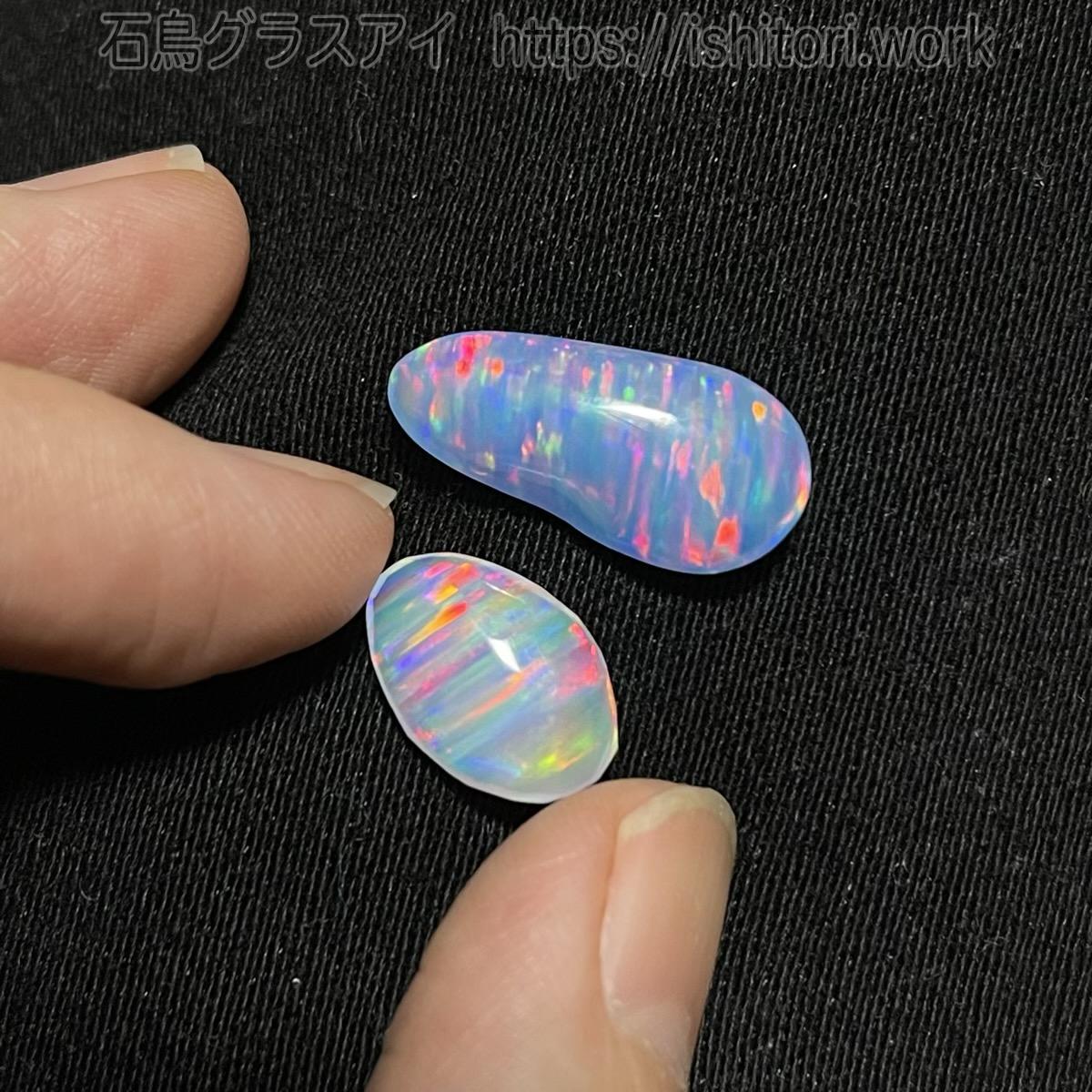 ハイブリッドオパール その他作品 2023.04.08 ハイブリッドオパールは、樹脂とシリカ(天然オパールと同じ成分)で作られた国産の人工オパールです。原石を購入して研磨して遊んでます。 あとでもう少し追記します。 ネオンオパールライトブルー赤斑ホワイト赤斑 オーロラ ブラック青斑